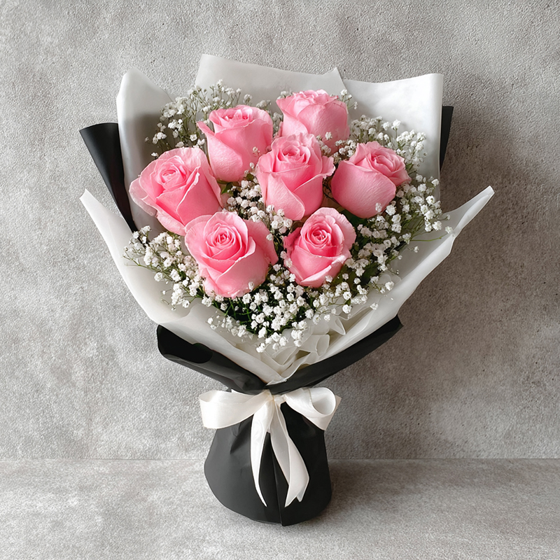 This bouquet is a fairytale where sweetness and romance intertwine. The soft pink roses, like a young girl’s blushing cheeks, exude tenderness and shyness. Surrounded by pure white baby’s breath, they appear even more delicate and charming. Wrapped in black and white like a classic poem, the bouquet outlines elegance with minimalist strokes. It is the embodiment of love and beauty, whispering stories of admiration and affection. Every breath of its fragrance softly hums a romantic love poem.